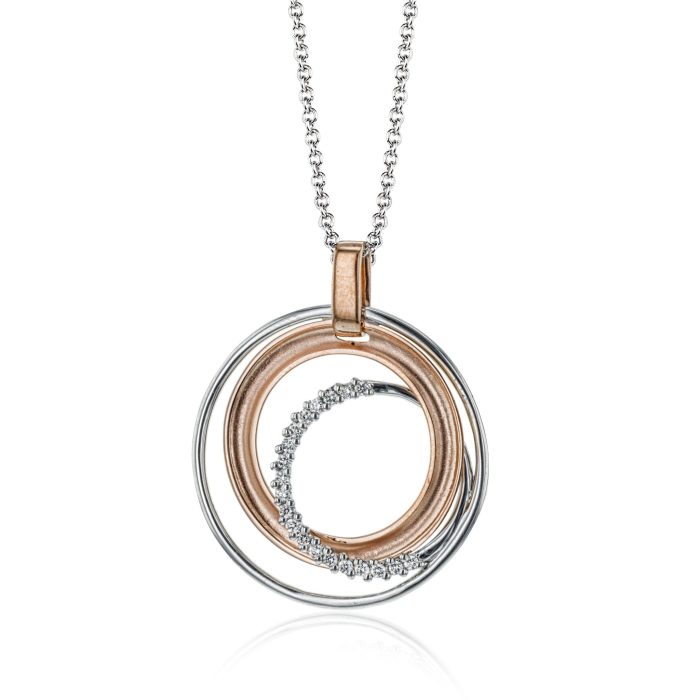 Interlocking rings of white and rose gold are accented with brilliant diamonds in this sophisticated pendant design.